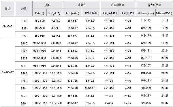 钐钴永磁材料由粉末冶金法制成,其化学组合为分为SmCo5及Sm2Co17两种,是目前磁性能仅次于钕铁硼的磁性材料,此种材料的优点在于它的磁性能稳定性和耐温性,以及超强的抗锈蚀性,是烧结钕铁硼磁体在特殊要求环境下不可多得的替代品。其缺点在于它的坚硬和脆性,可加工性具有一定的局限性。